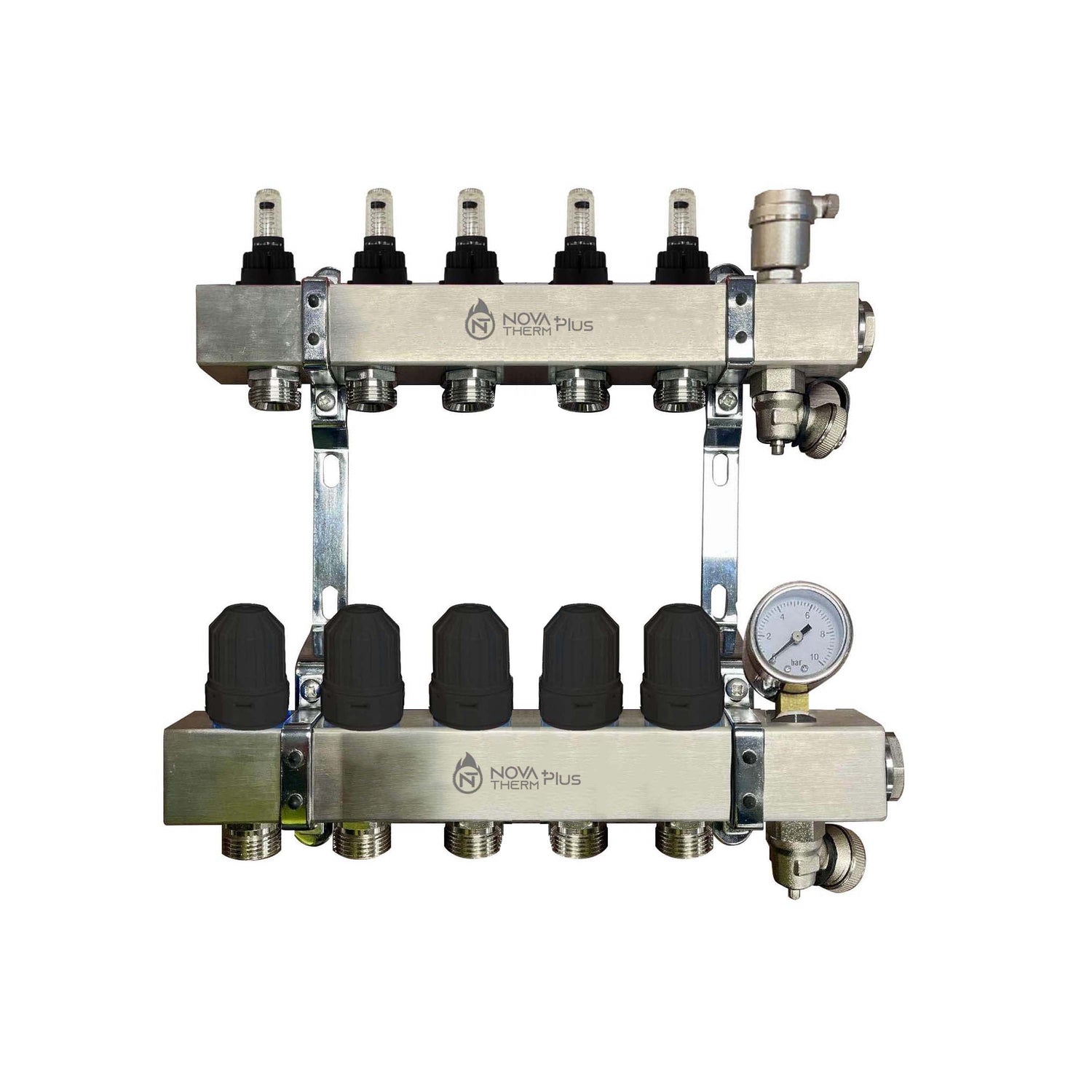 NovaTherm Plus 5 Port Dualmix Premium Auto Balancing Stainless Steel Manifold Assembly inc Pressure Gauge and Air Vent